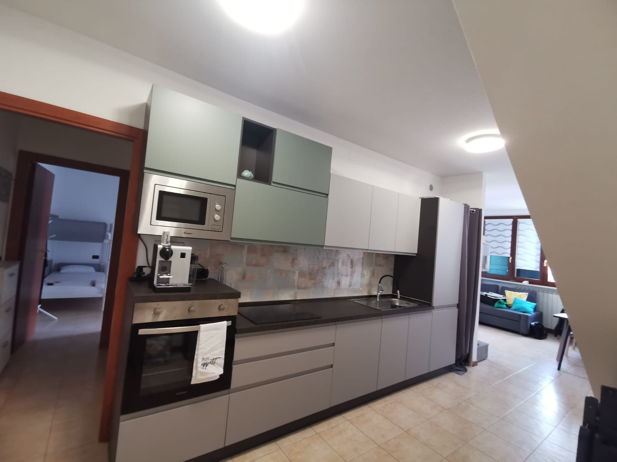 La cocina americana, de inducción, está equipada con nevera, microondas, horno, congelador, lavavajillas, vajilla/cubertería, utensilios/cocina, cafetera, tostadora y hervidor de agua.